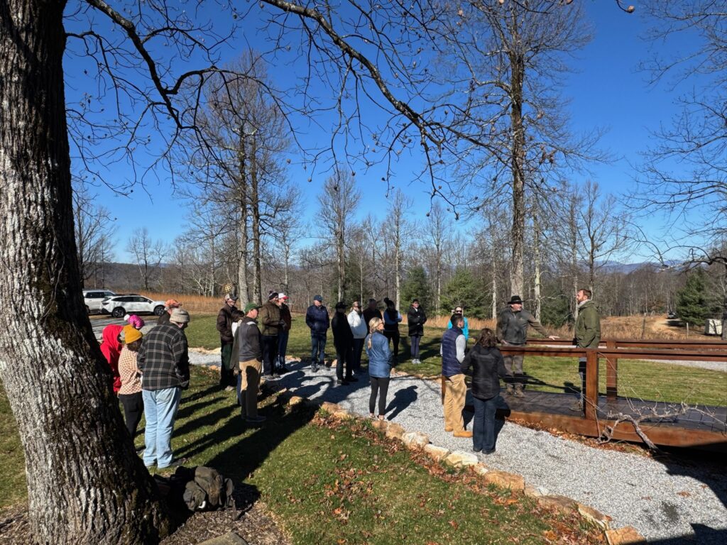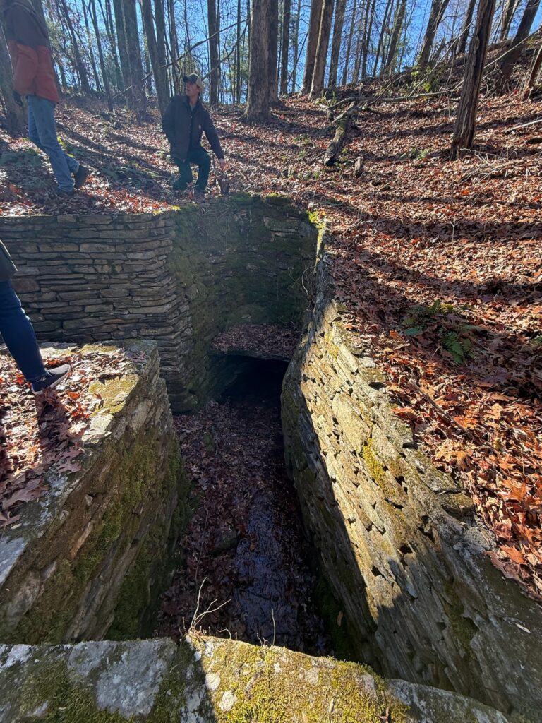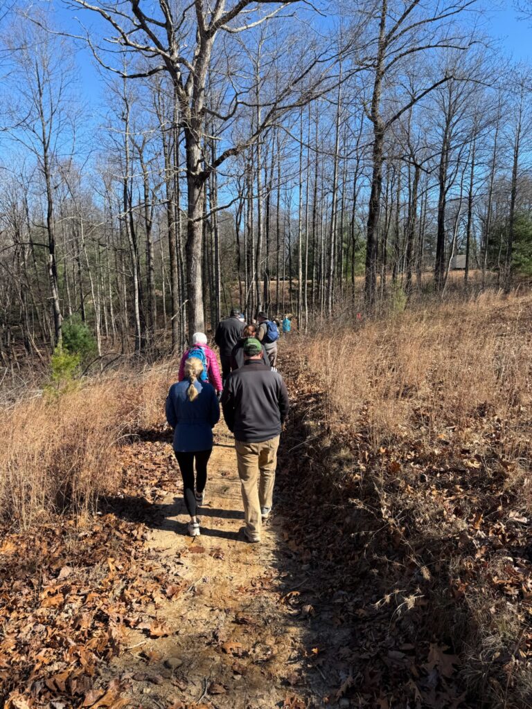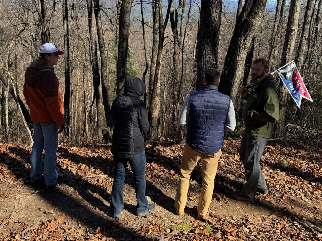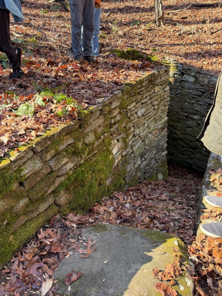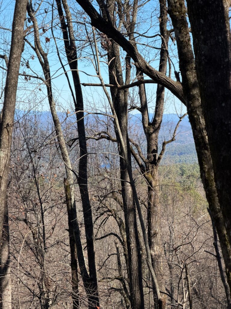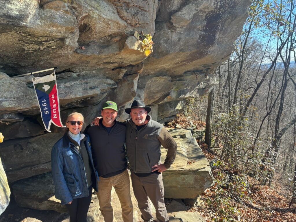 Sarah guided the group to overlooks with views of both Seed Lake and Lake Rabun, and later led hikers into the valley where cider apple trees and Christmas trees have recently been planted. One adventurous group continued on the final ridge section, a narrow “cat trail,” and made their way to a hidden cave encased within rock formations believed to have served as a lookout platform. Their exploration ended abruptly after hearing a distinct hissing sound deeper inside.