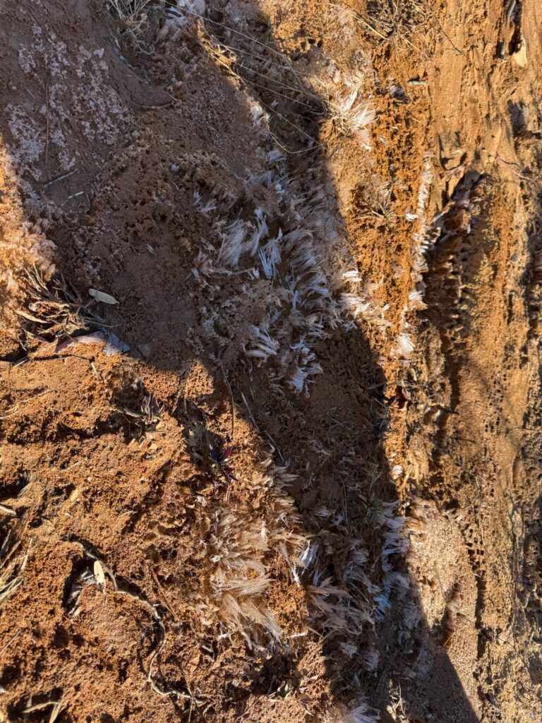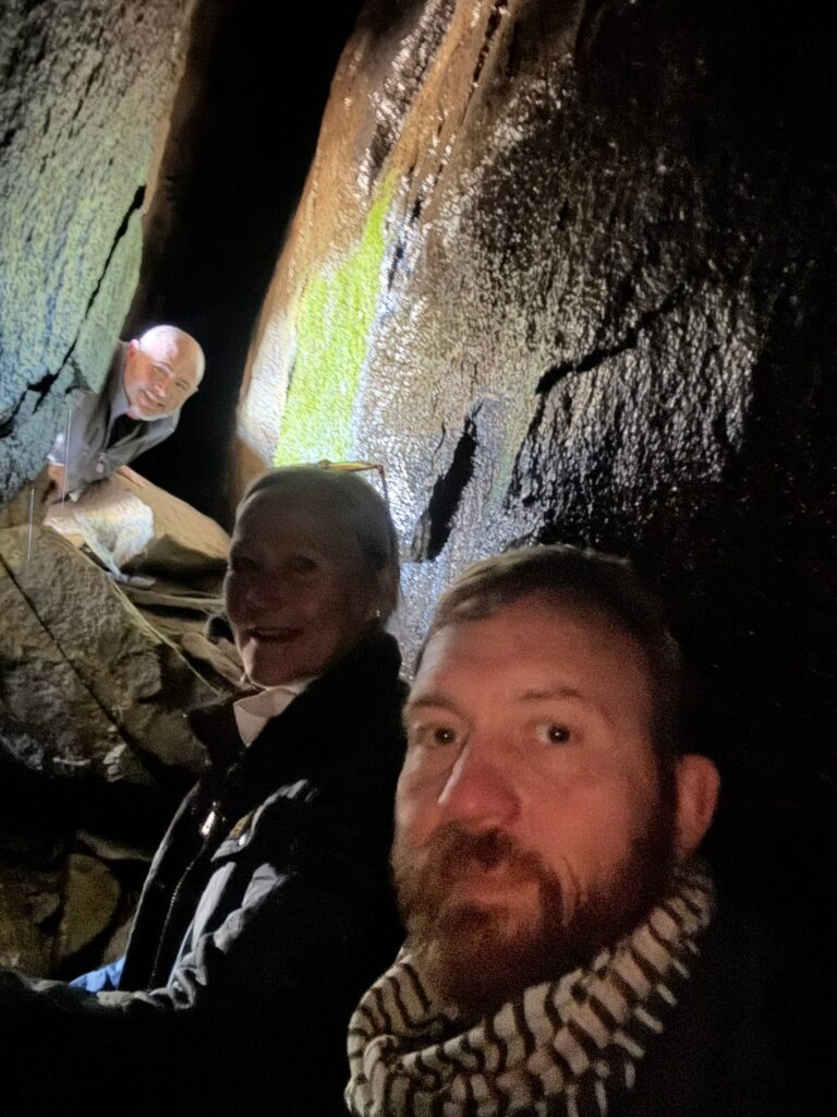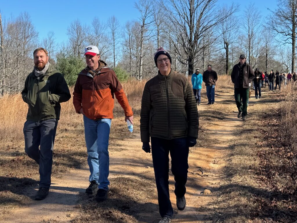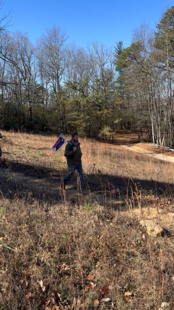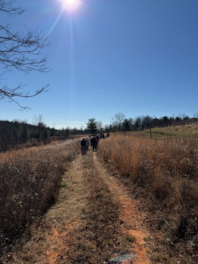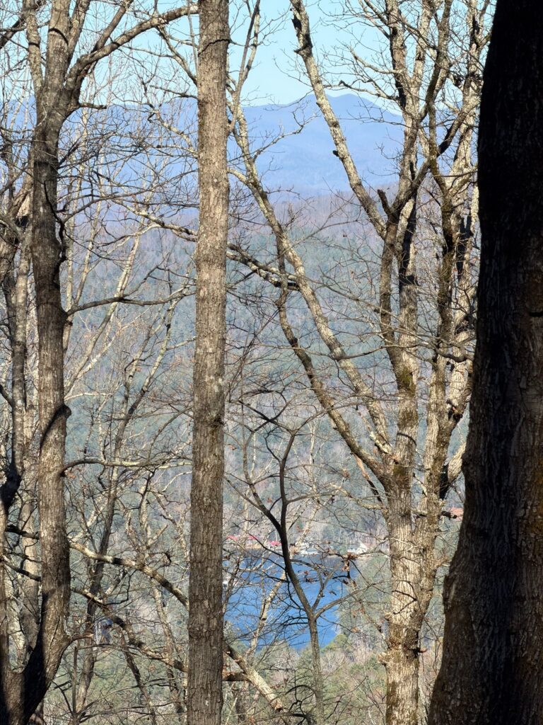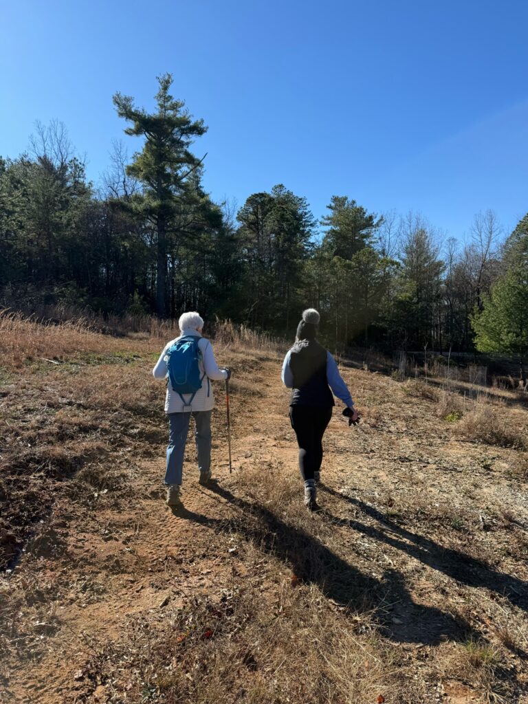 Sarah guided the group to overlooks with views of both Seed Lake and Lake Rabun, and later led hikers into the valley where cider apple trees and Christmas trees have recently been planted. One adventurous group continued on the final ridge section, a narrow “cat trail,” and made their way to a hidden cave encased within rock formations believed to have served as a lookout platform. Their exploration ended abruptly after hearing a distinct hissing sound deeper inside.